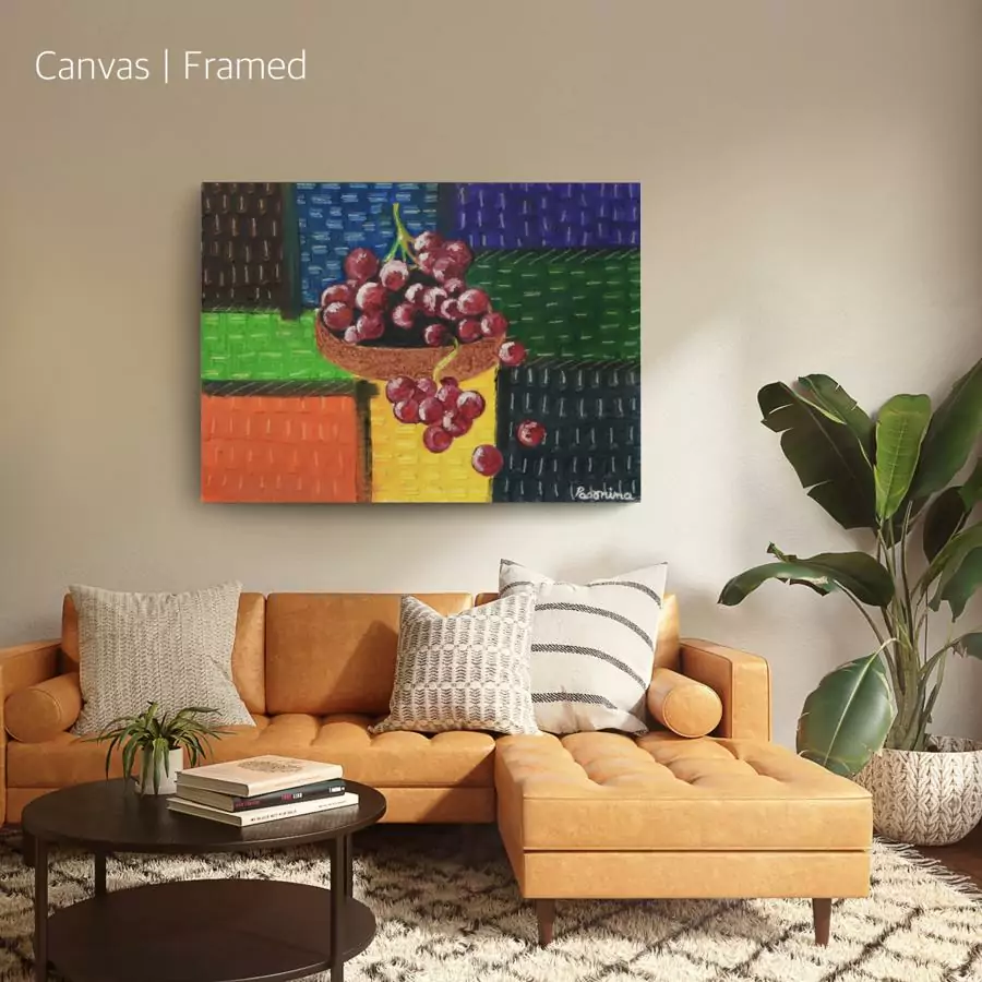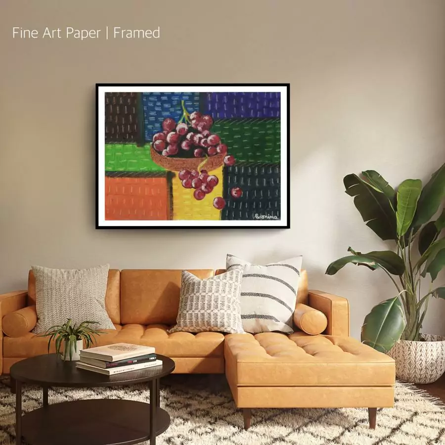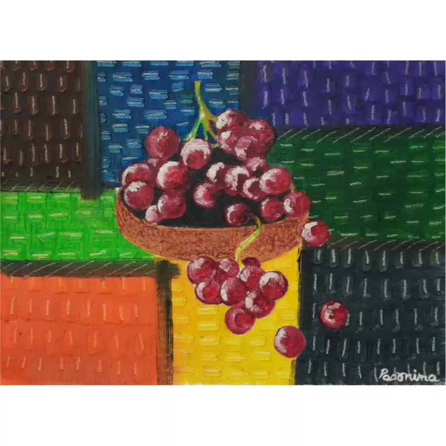 I have lovingly worked into this painting. This painting has a tone of contrasting colors in the background. The subject matter in this painting is the saturated red grapes. The painting is side lit and having bright natural light gives a lively attribute to this artwork and the sharp highlight on the grapes gives a beautiful finish.