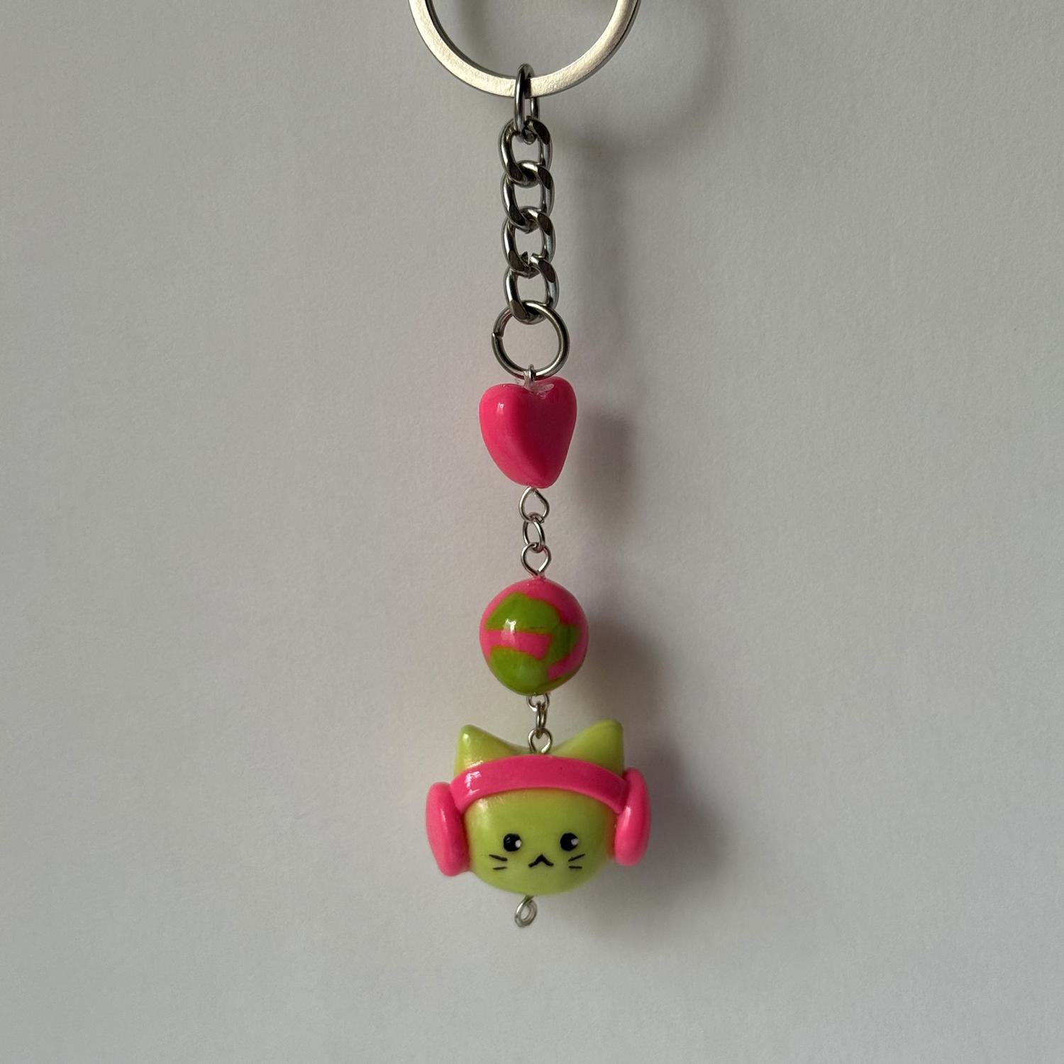 Keychain includes three charms: cat with headphone, marble bead, heart.