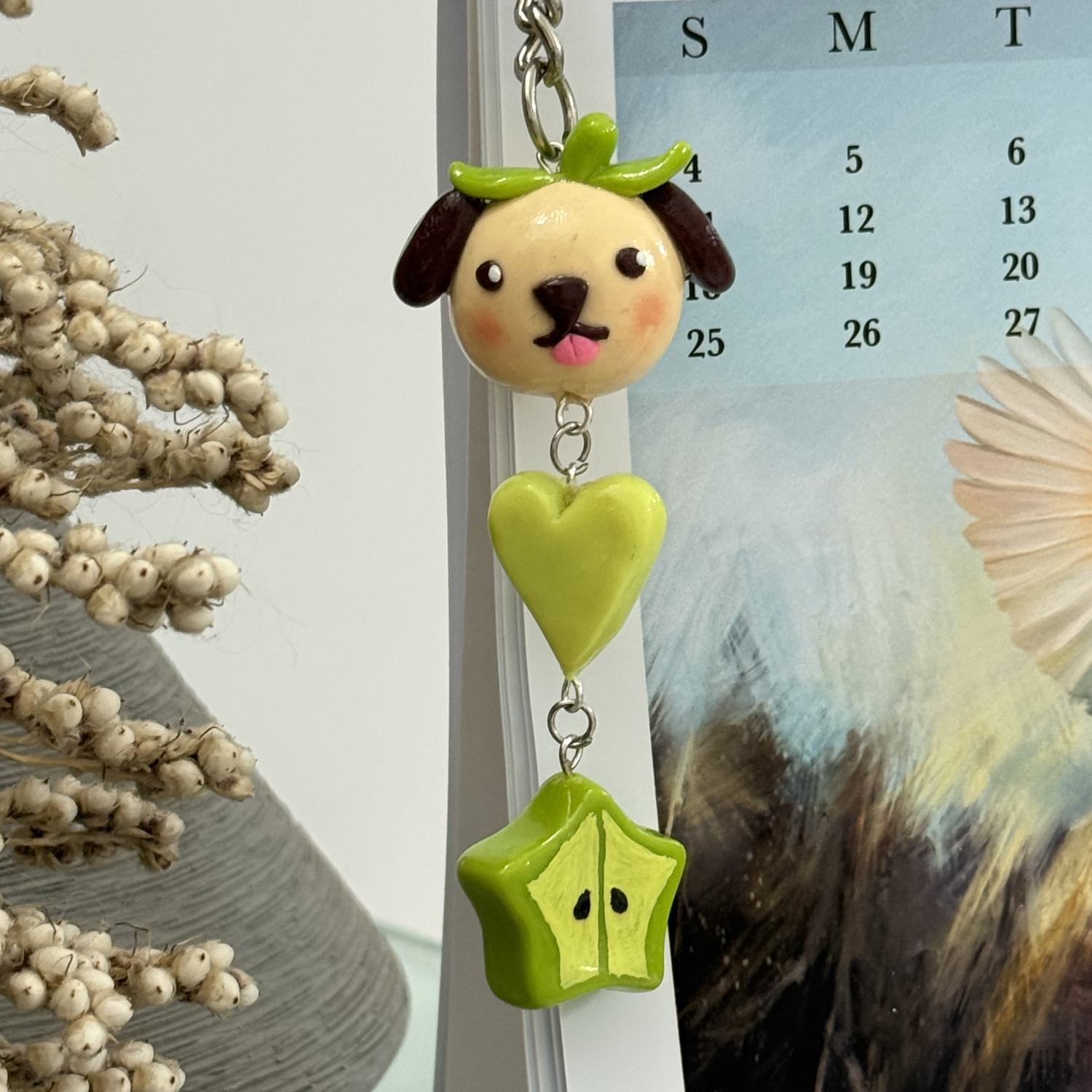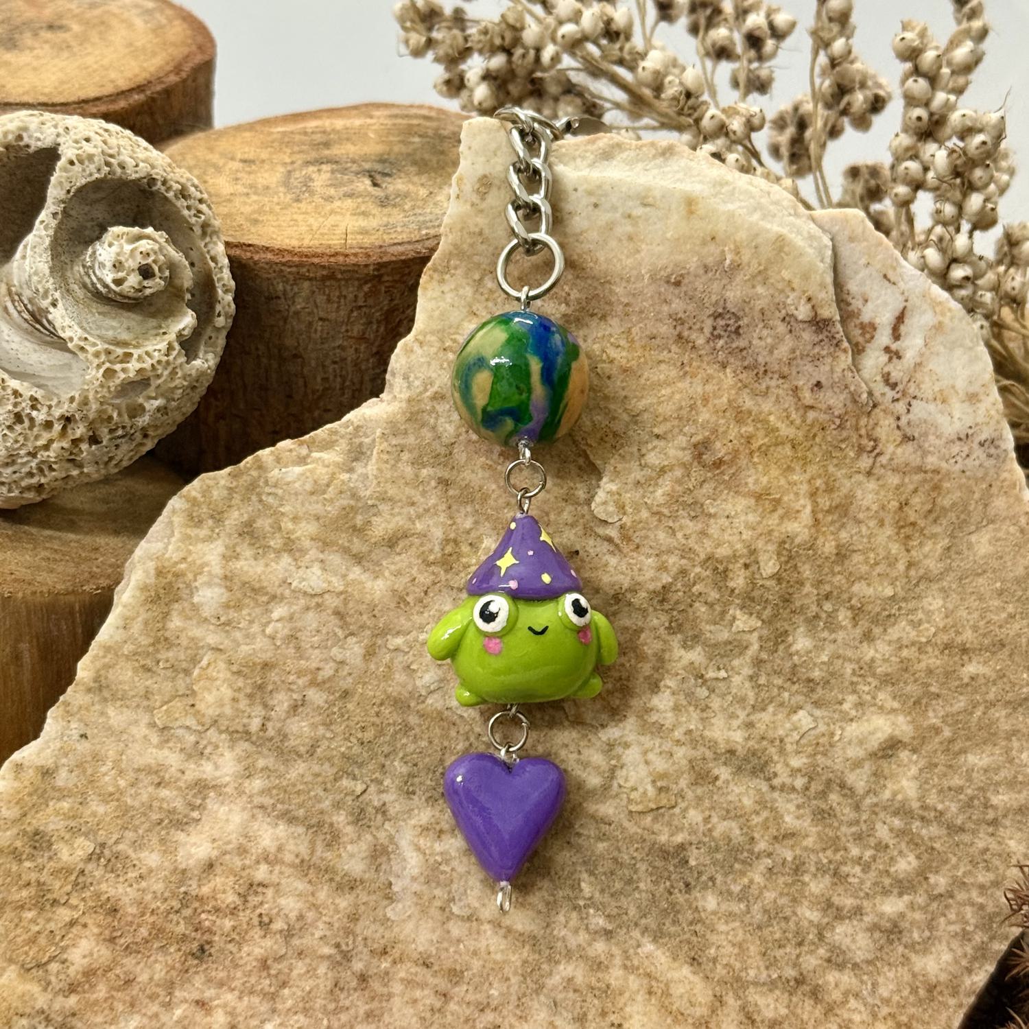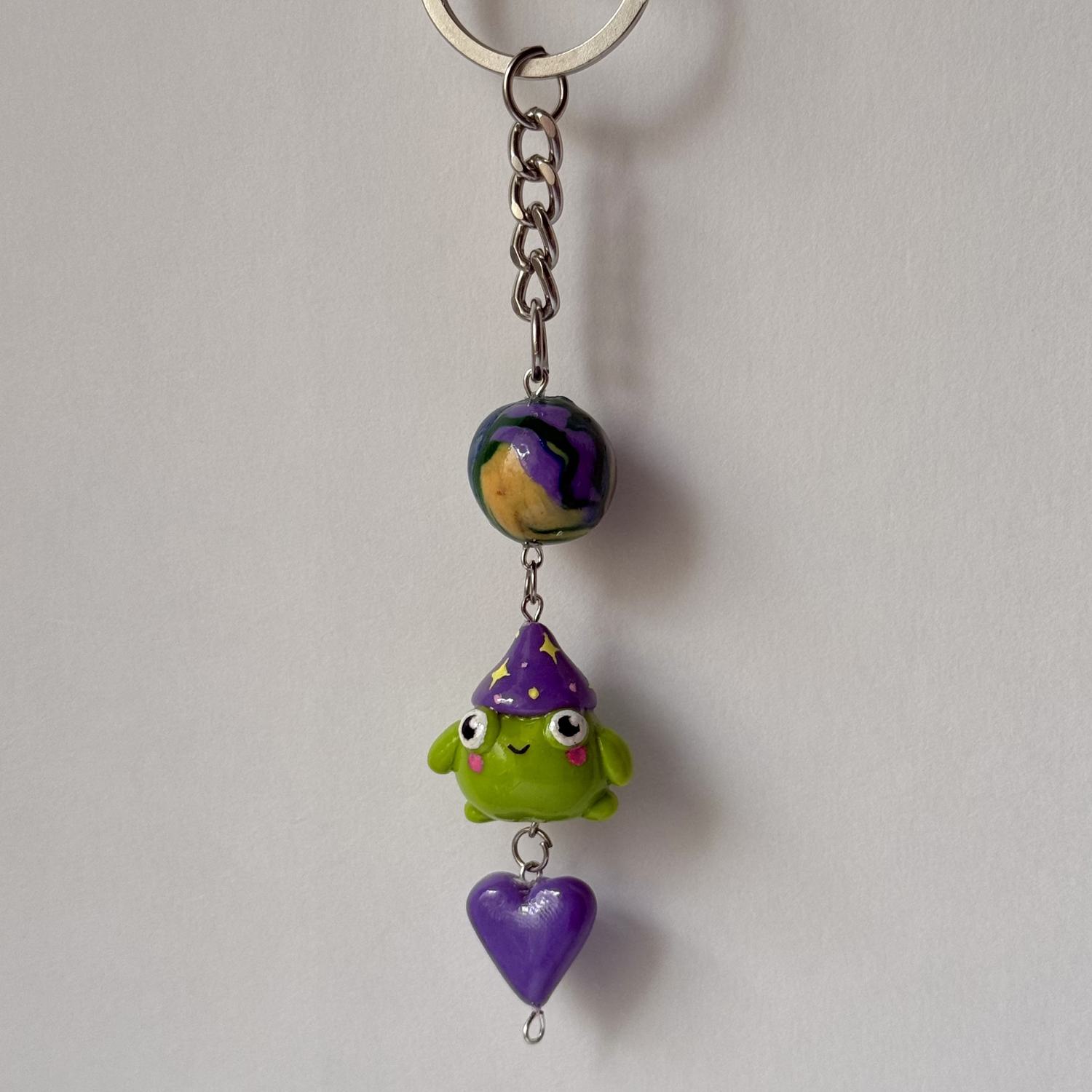 Keychain includes three charms: frog with leaf hat, triangle bead, green grapes.