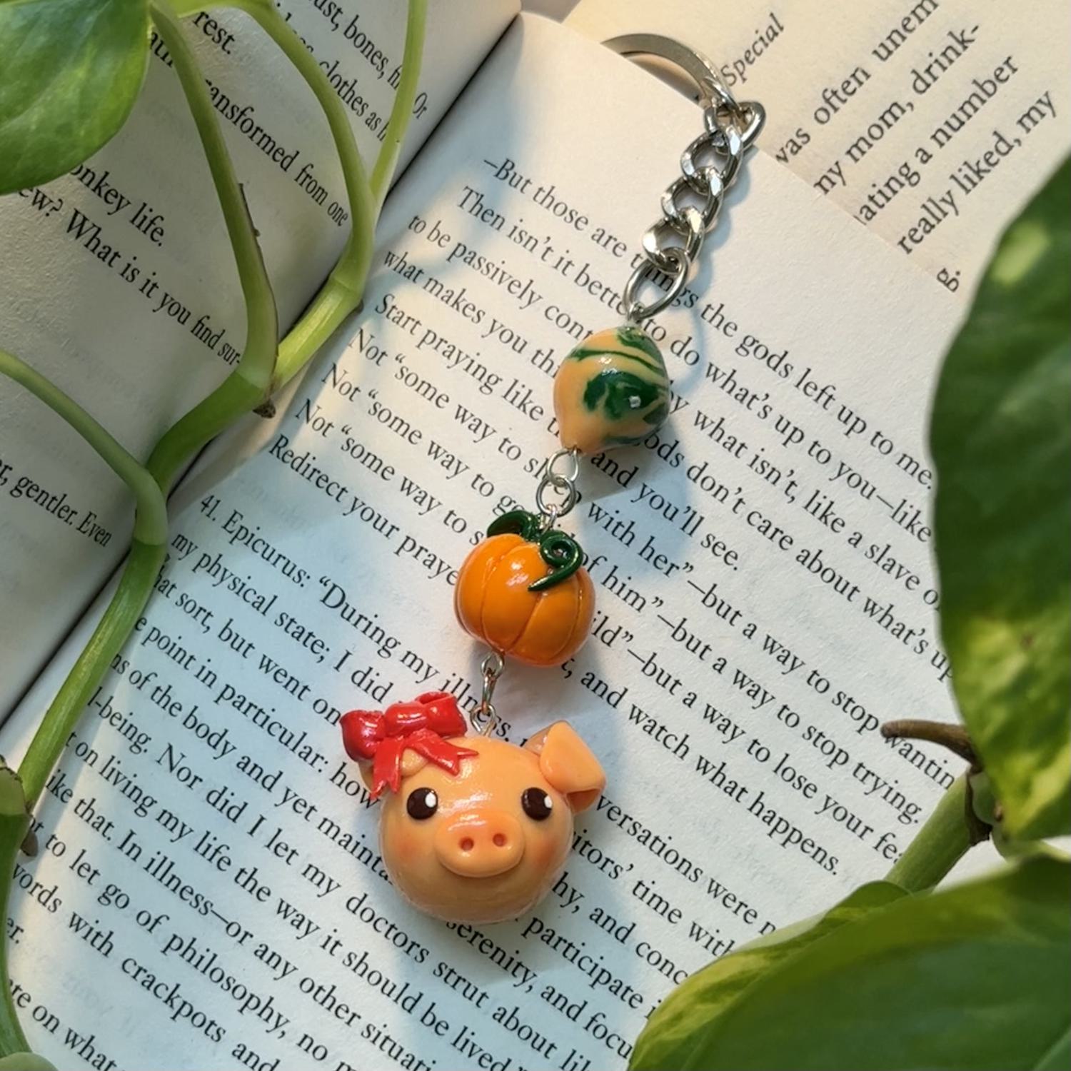 Keychain includes three charms: piggy with ribbon, marble bead, pumpkin.