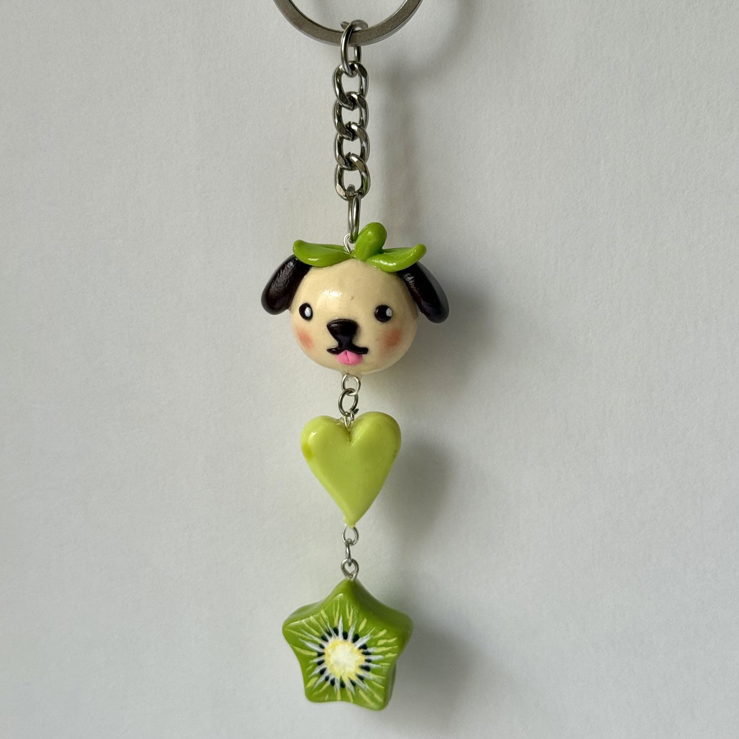 Keychain includes three charms: kiwi and apple star, heart, puppy.