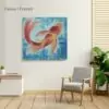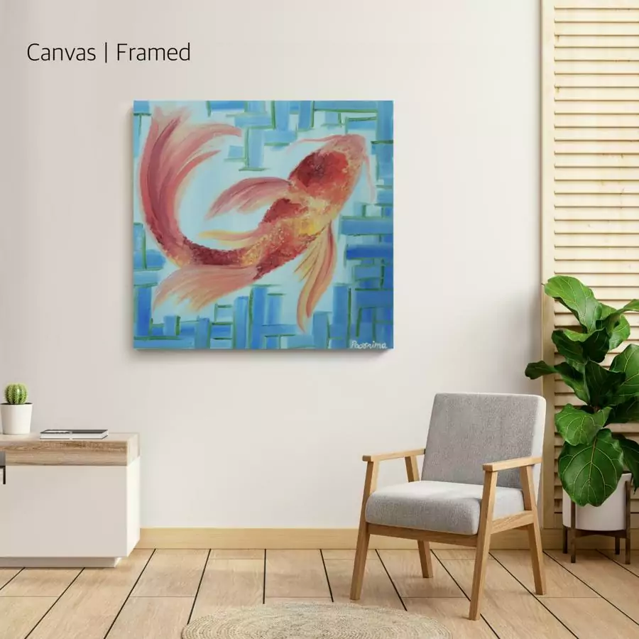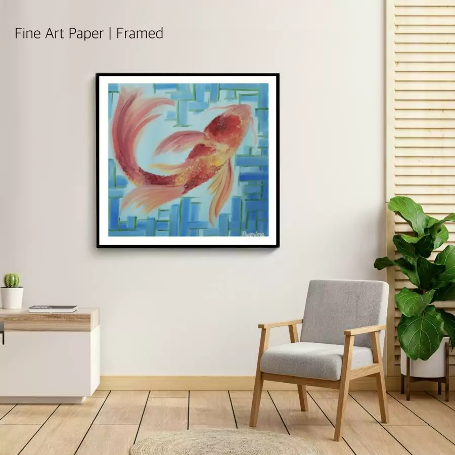 The main focus in this painting is on the Koi fish of rich yellow and red tones which is centered on the pale blue background. This painting has a tone of contrasting warm and cool colors. The border of this art piece is painted in blue patterns makes the subject matter more confined and captivating. Beautiful scaly patterns exhibit a touch of liveliness to the main object in this artwork. I have lovingly worked into this piece of highly detailed artwork.