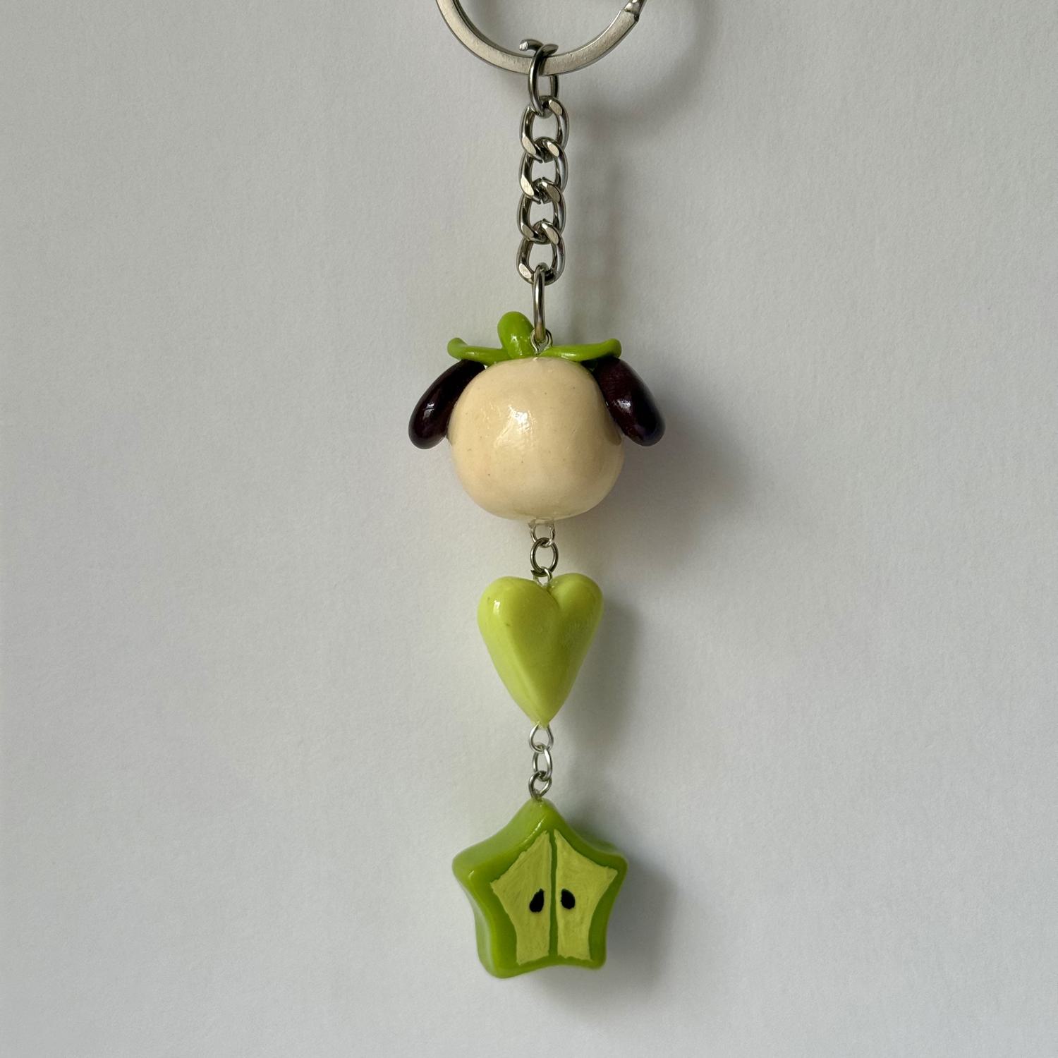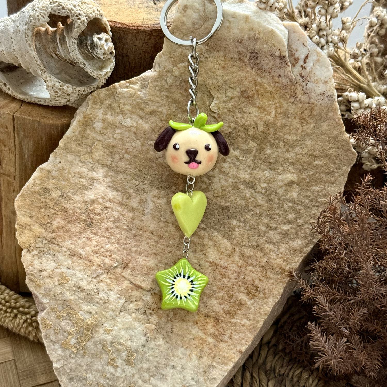 Keychain includes three charms: kiwi and apple star, heart, puppy.